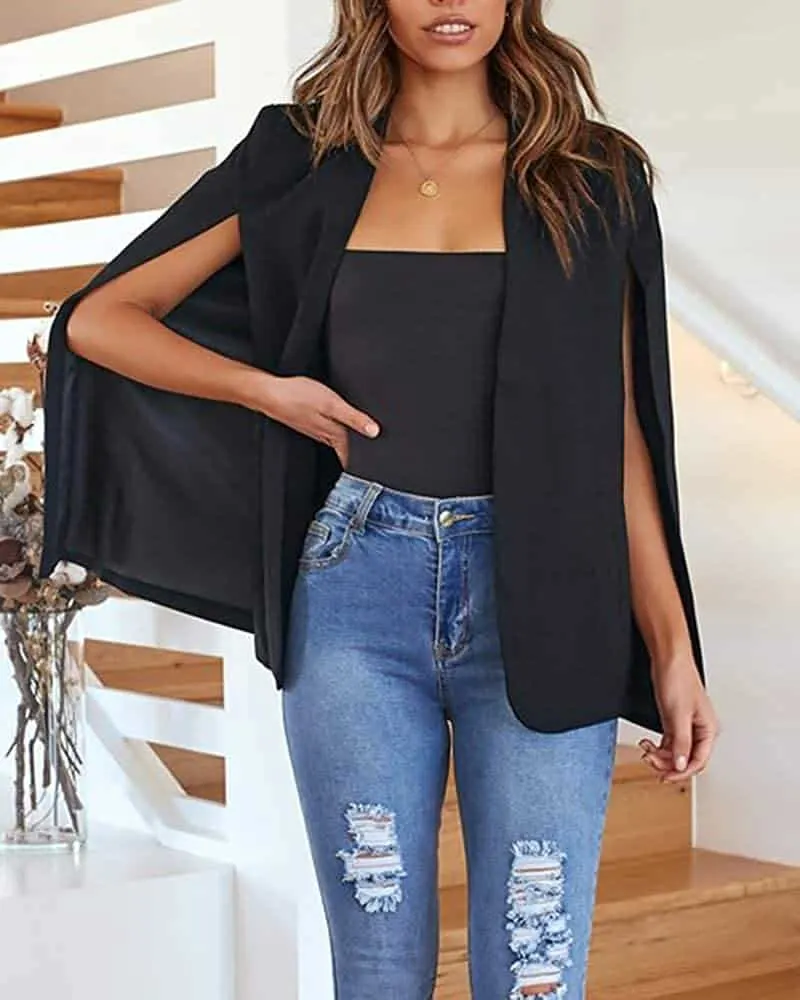 Throw on this black cape blazer over your V-neck white jumpsuit and you’ll never feel anything missing from your style.